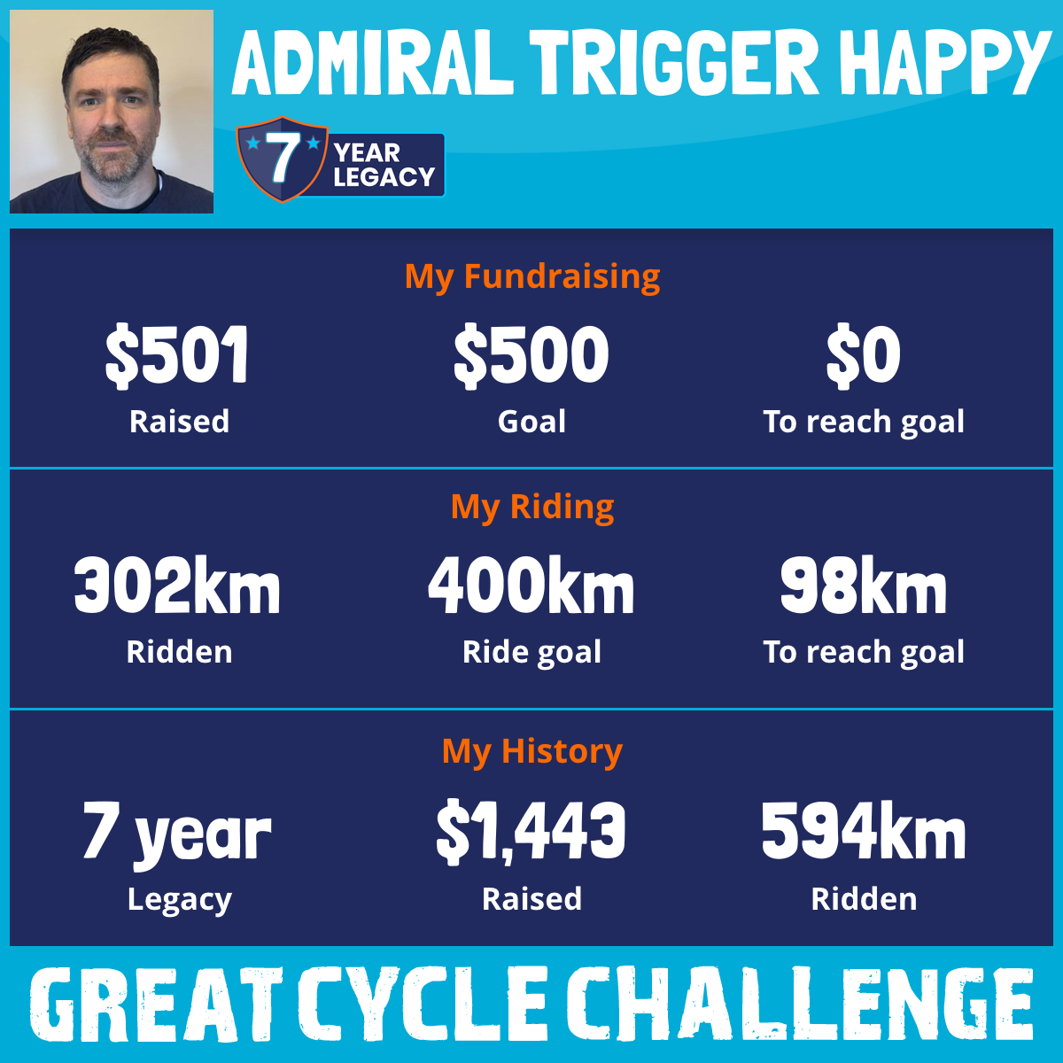 To add to the challenge and have some fun along the way supporting this good cause I will be live streaming me on the exercise bike working toward the goal. I will also be creating fun challenges and ways for the audience to participate along the way. So head over to my Twitch page at https://www.twitch.tv/admiraltriggerhappy/ and follow for more updates and to have some fun with me come October.