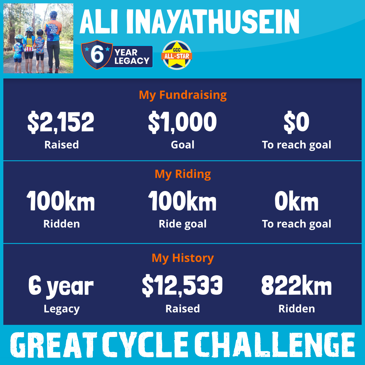 Last year, my daughters Munira & Naqiyah, son Taha and I took part in the Great Cycle Challenge to fight kids' cancer - Over the last 5 years, we have raised over $10,000 and cycled more than 700km. This year we are riding again with the support of friends and family.