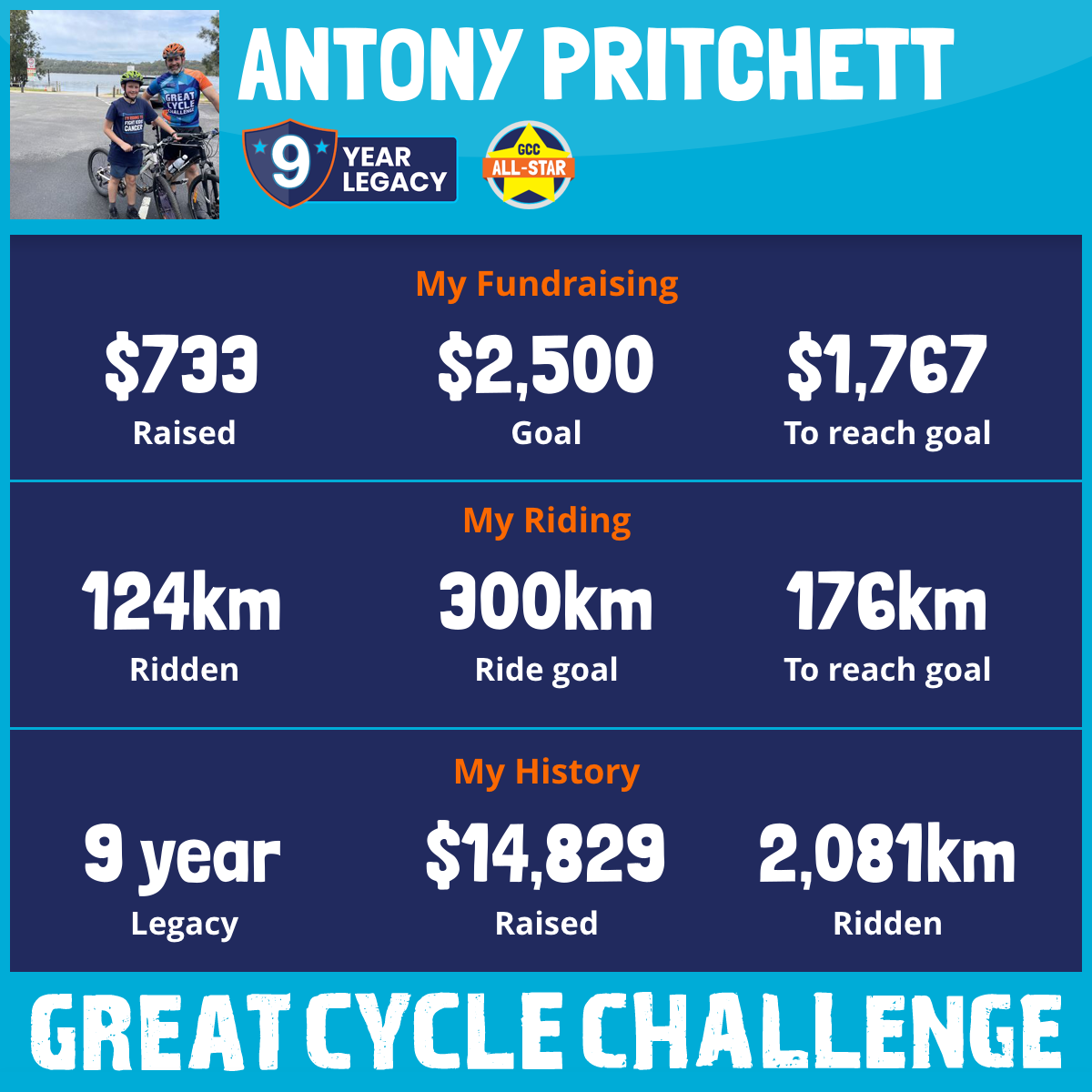 And so I am riding and raising funds to support the Children's Medical Research Institute to continue their work into the prevention, diagnosis, treatment and finding a cure for childhood cancer.