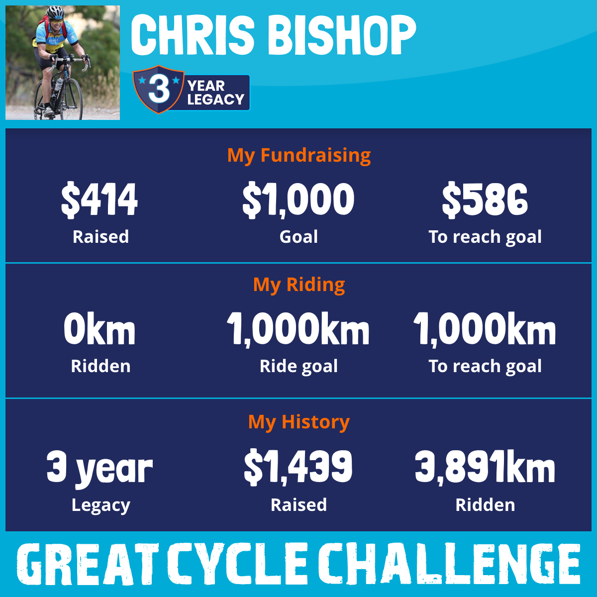 This October, I am taking part in the Great Cycle Challenge to fight kids' cancer!Because right now, cancer is the largest single killer of children from disease in Australia – over 600 children are diagnosed with cancer every year and sadly, 3 die every week.Kids should be living life, not fighting for it.And so I am riding and raising funds to support the Children's Medical Research Institute to continue their work into the prevention, diagnosis, treatment and finding a cure for childhood cancer.Please support my challenge by making a donation through my fundraising page to give these kids the brighter futures they deserve.Together, we can save little lives.