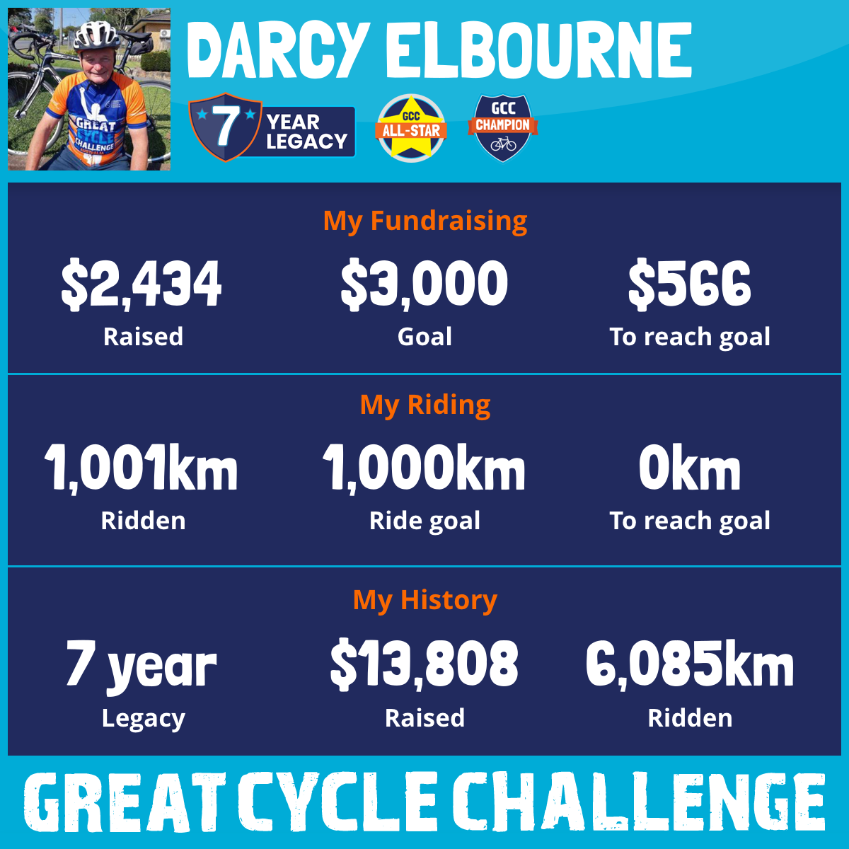 This year see me as a seven year veteran in the support of the battle in fighting childhood cancer. Whilst the kms achieved and money raised has always been way beyond my expectation. The generosity of my sponsors has been fantastic and has spurred me on to go further on my bike.