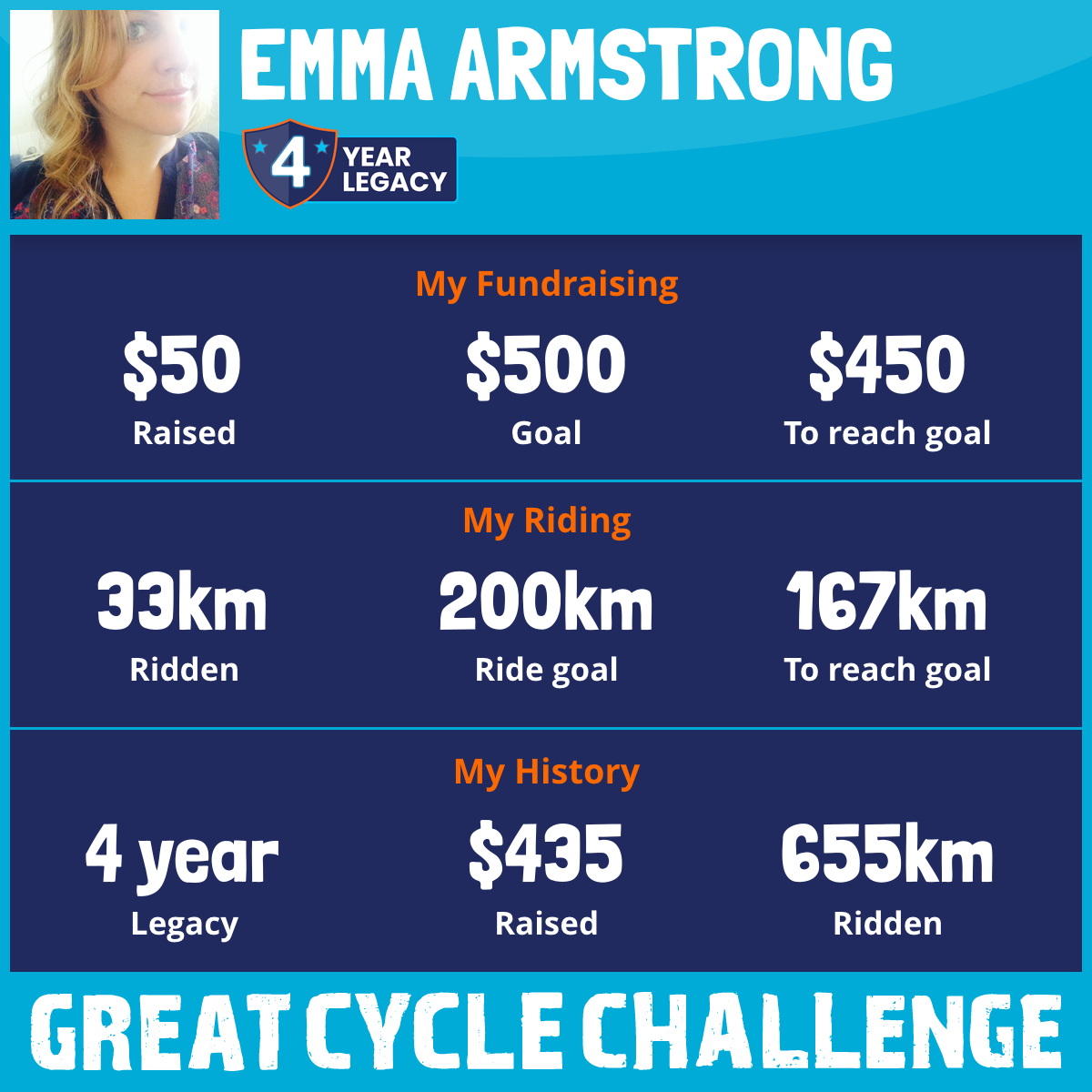 And so I am riding and raising funds to support the Children's Medical Research Institute to continue their work into the prevention, diagnosis, treatment and finding a cure for childhood cancer.