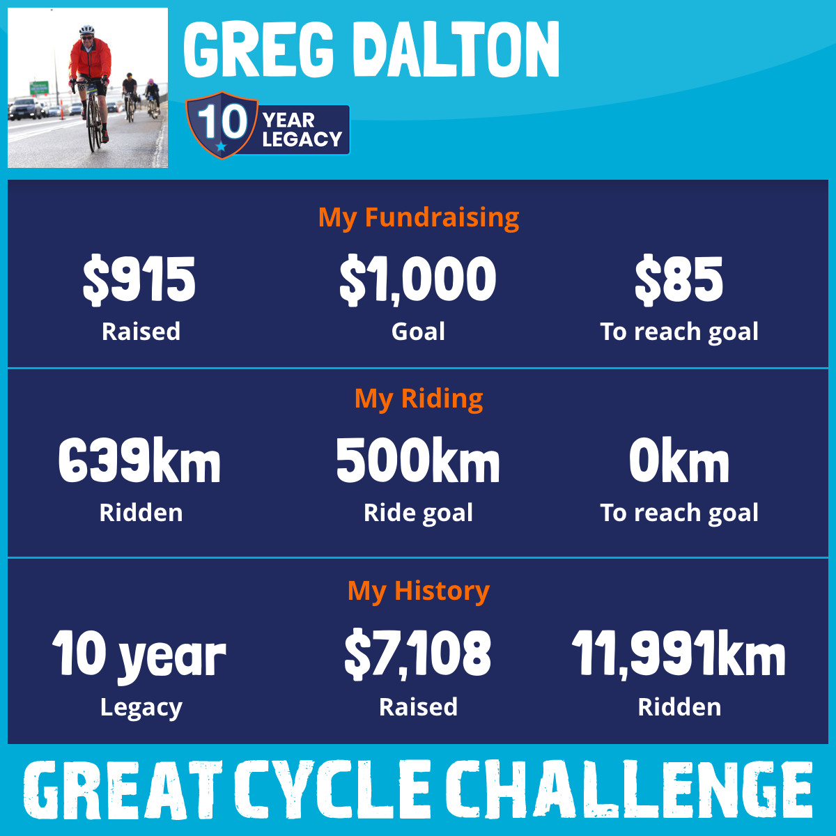 This October, I am again taking part in the Great Cycle Challenge to fight kids' cancer! This year is my tenth year of The Great Cycle Challenge. This year I am starting slowly as I am currently rehabilitating following total knee replacement in April. But I should achieve my cycling goal and my donation goal.