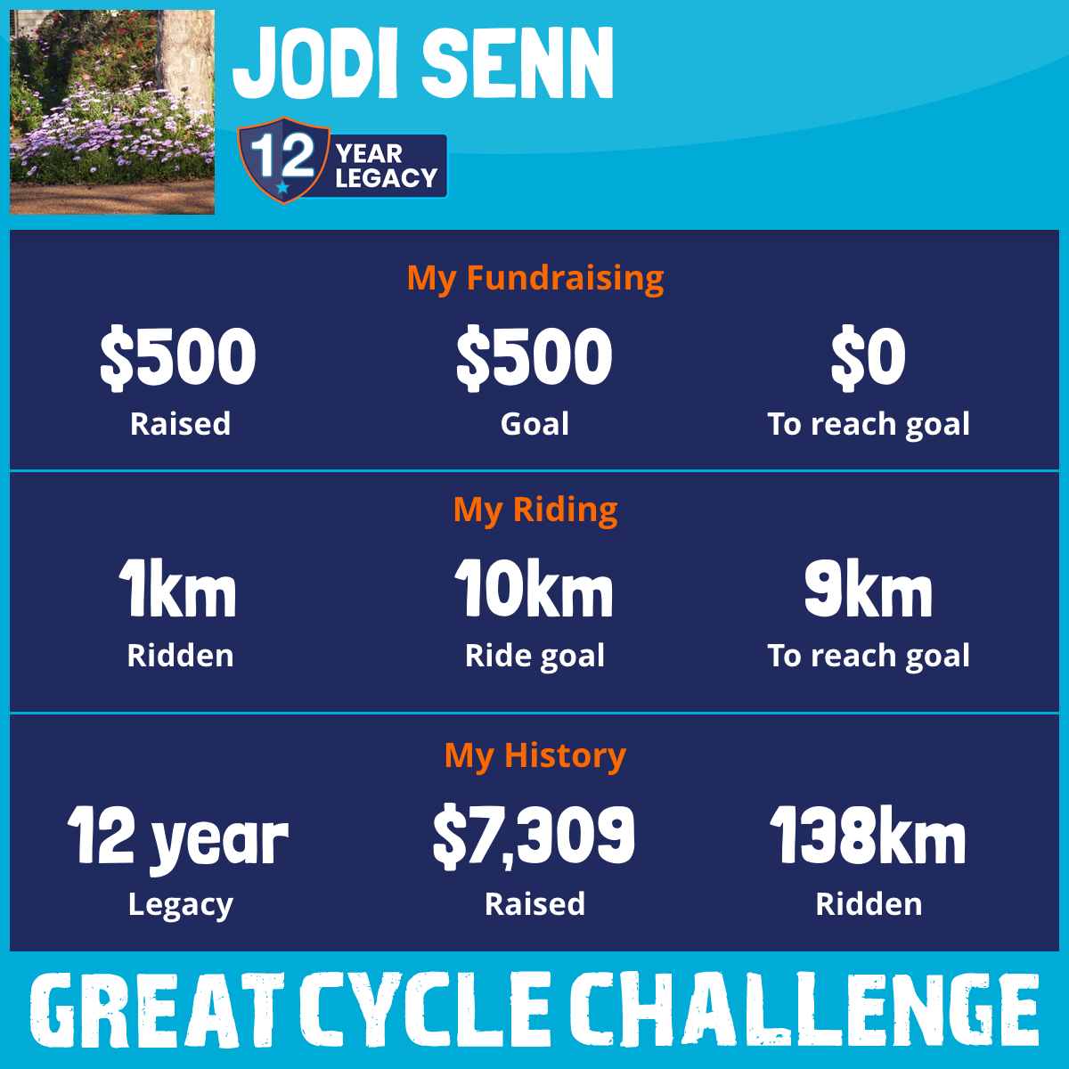 This October, I am taking part in the Great Cycle Challenge to fight kids' cancer! I'm riding with my new knee and my dodgy one so I've set my goal for kilometers a little lower than in previous years. This year I'm riding to show support for those past and present students who have fought this tough battle. In particular one brave young man who sadly lost his fight - whilst he may have been a grown up now he shall forever be a little boy with a huge smile in my heart - This one is for you Elijah xxx I'm also riding this year again in memory of my sister Vicki - always in my heart -- cancer sucks. Also for a new victim Sara Holmes. xx taken too young.