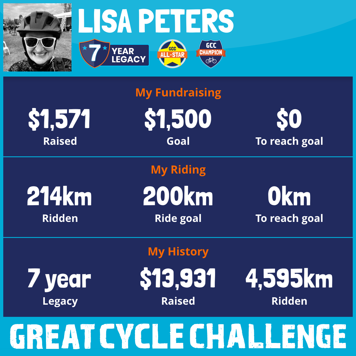 “Couldn’t be prouder, as we acknowledge, Lisa’s 7th year, under going the great cycle challenge. supporting children with cancer.”