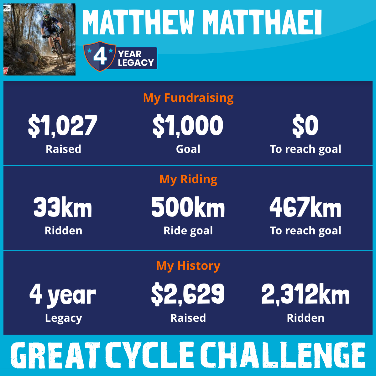 And so I am riding and raising funds to support the Children's Medical Research Institute to continue their work into the prevention, diagnosis, treatment and finding a cure for childhood cancer.