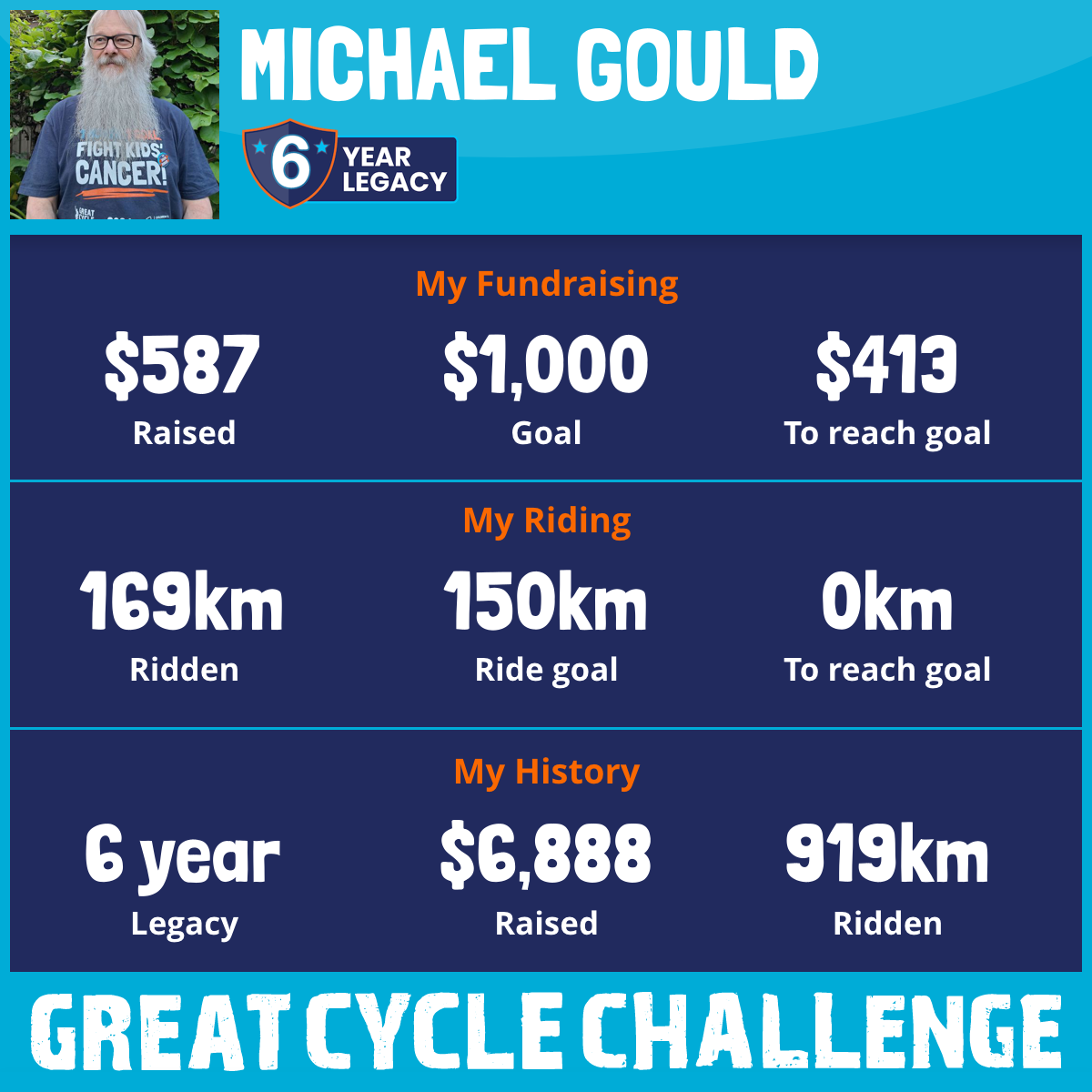 This year I'm challenging myself to ride 125km, the same last year and have set my fundraising target at $1,000.