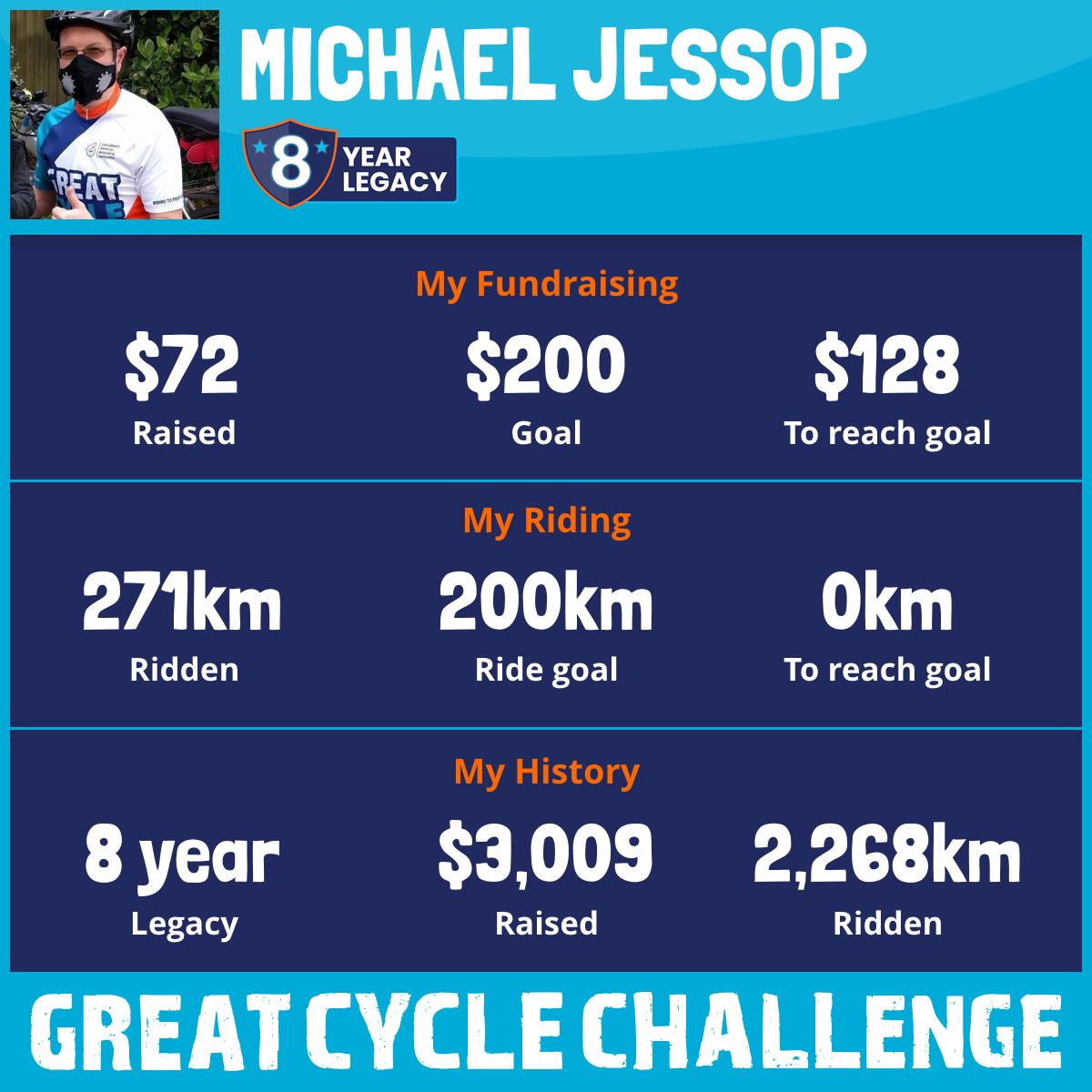 And so I am riding and raising funds to support the Children's Medical Research Institute to continue their work into the prevention, diagnosis, treatment and finding a cure for childhood cancer.