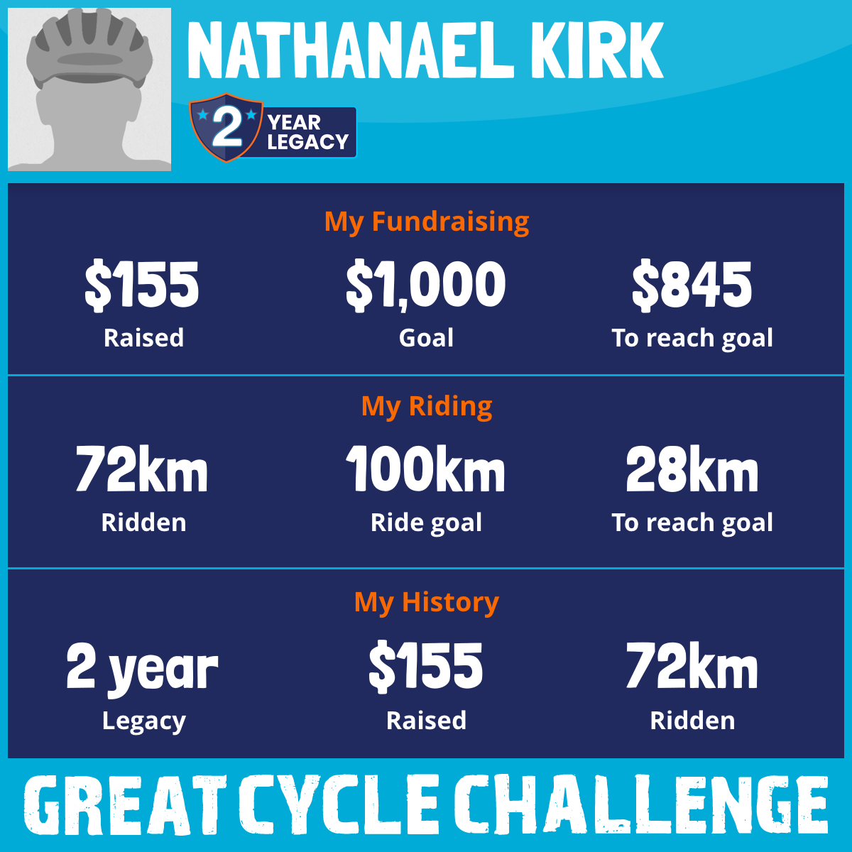 I am riding 100 km for my grandfather, Nathanael. Please sponsor me and support my challenge to fight kids' cancer and save little lives.