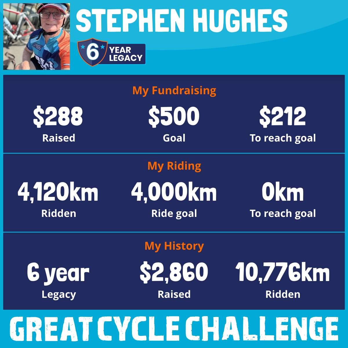 As it comes ever so close once again to ride i dedicate this ride to my friends and my dear Dad who have lost their battle to this disease Cancer by doing this and also riding for our future kids with Cancer we fight the battle to win and give them the chance to also be a survivor and live on as research and medical treatment becomes available to kick Cancers butt from our kids who have not even lived life but will because each one of us that rides makes this possible through the funds raised by the challenge warm Regards Stephen T Hughes