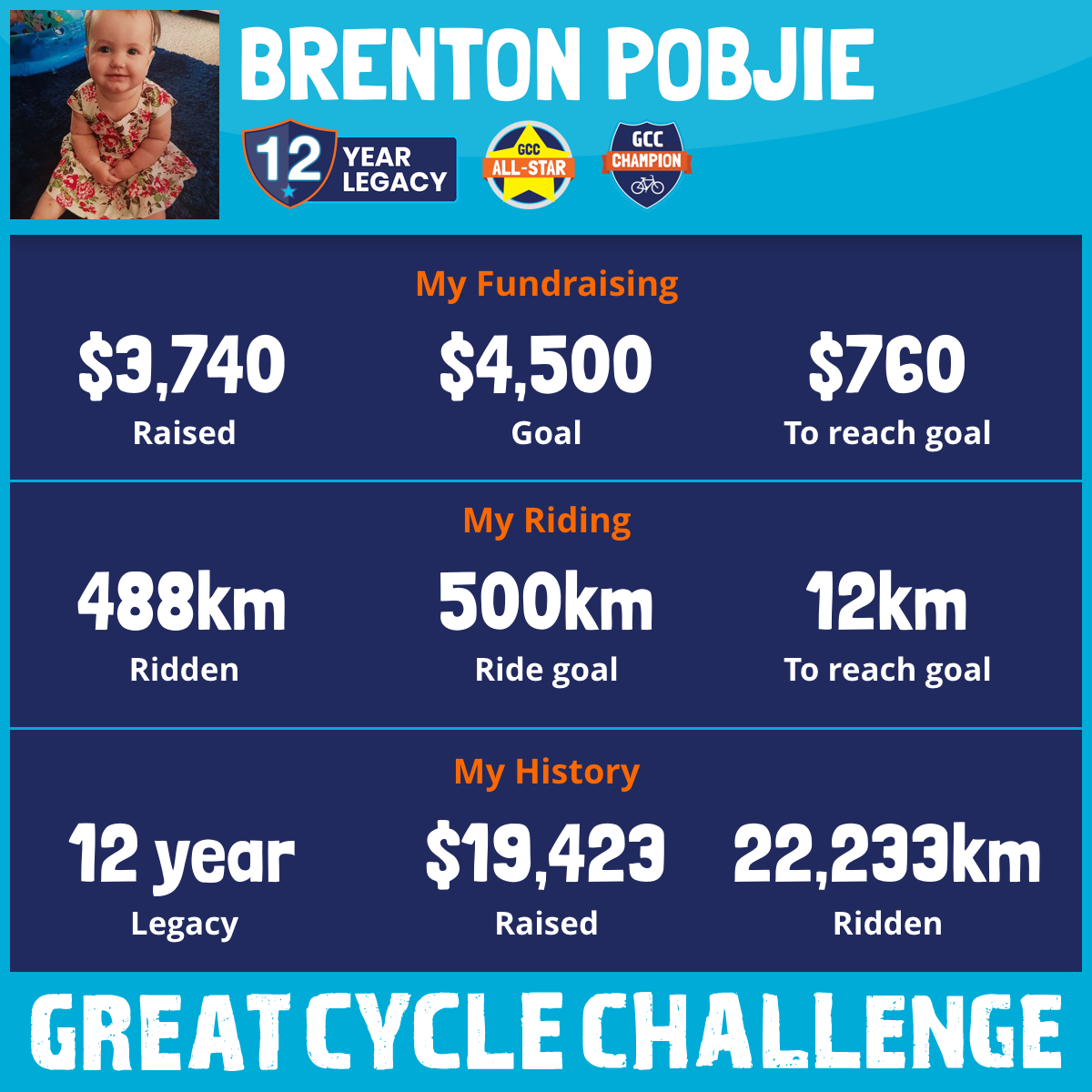 This October I am riding my bike in memory of young Ivy. Every kilometre will be a celebration of life, and to remember and honour the challenges that others face. She had a short but courageous fight. I want to do my bit to help alleviate the challenges that other children face and fight this horrendous disease.